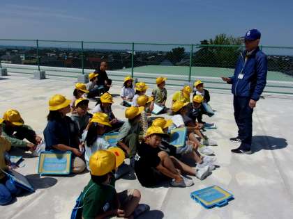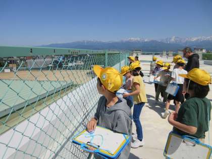 3年生 屋上から(社会科) 公開日 2024/05/10 更新日 2024/05/10 3年生 方位磁針で東西南北を確認した後、どんな建物が見えるかを調べました。自分の家がどこにあるか探している子供たちでした。