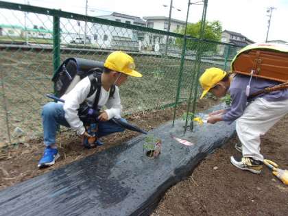 2年生は野菜を育てています。一人一人が選んだ苗を植えました。毎朝、野菜の生長を確かめている2年生です。