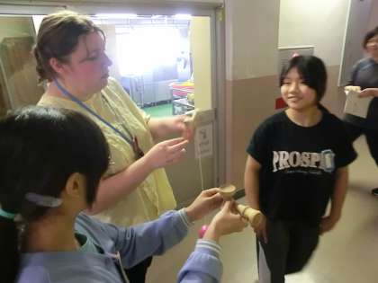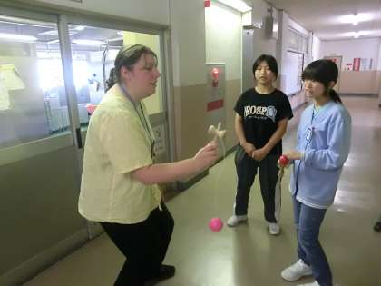 休み時間、6年生の二人が、マディ先生にけん玉を教えていました。