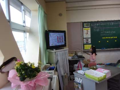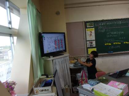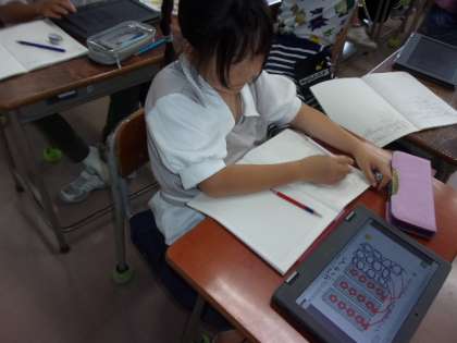 算数の時間には、わり算の解き方を考えました。デジタル端末を活用して、おはじきを動かしながら考えました。