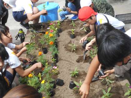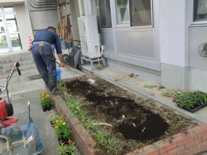 1限目、用務員さんが花壇を耕し肥料と石灰を入れてくださったおかげで、大休憩の15分間で環境委員会全員で、花壇に花の苗を植えることができました。