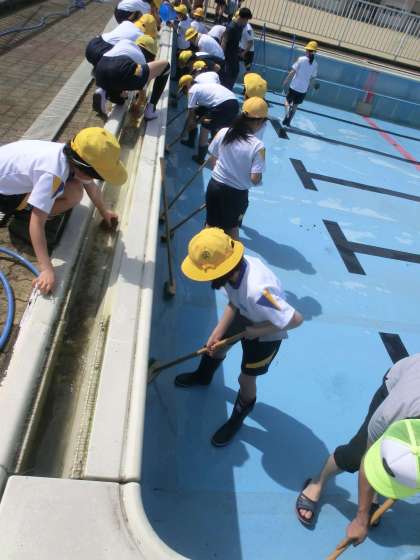 来週の金曜日のプールびらきに向けて、今日は5,6年生が、プールの中とプール周りの溝の清掃を行っています。用務員さんが大まかなヘドロをとってくださいましたが、細かいところに黒い頑固な汚れがたくさんついています。力一杯こすってもなかなか汚れは落ちませんが、力を合わせてがんばっています。