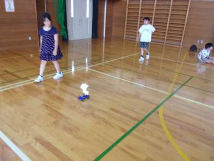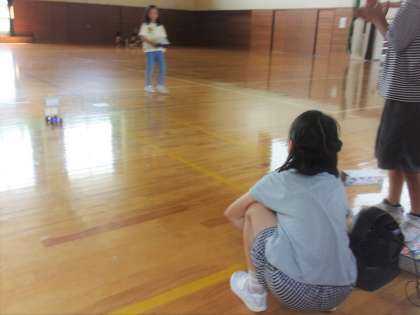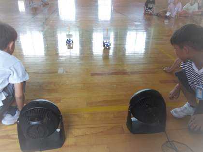 体育館で送風機を使って車を走らせました。風の強さを変えたり、風受けの大きさを変えたりして、どうやったら長い距離を走らせることが出来るか考えました。