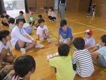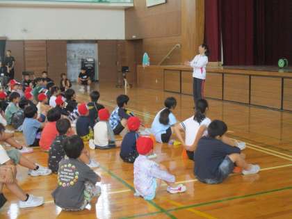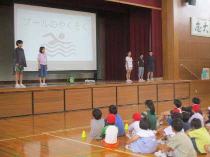 プールに入るときの約束を確認しました。 ファミリー班で目当てを伝え合いました。