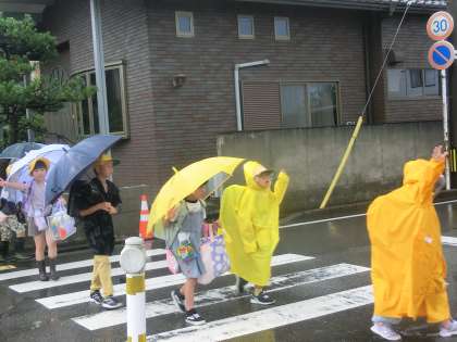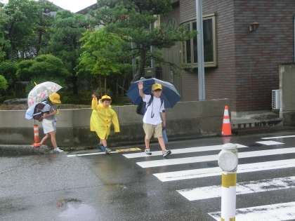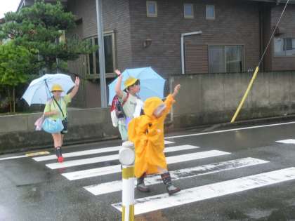 雨の日でも、安全に横断歩道を渡ることができていますね。手では伝わらないと思ったのか、傘を高く上げて、運転手さんに横断歩道を渡る意思を伝えている上級生もいました。