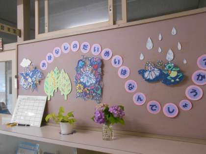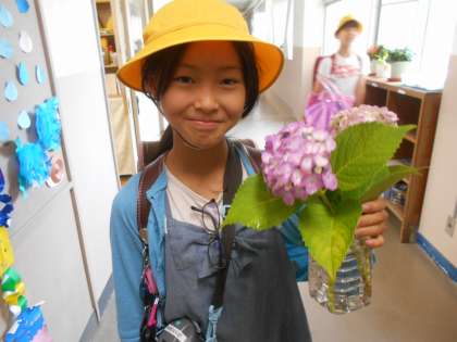 今朝、職員室に「家に咲いていたから持って来た」とアジサイを届けてくれた子供がいました。早速、図書室前に飾りました。