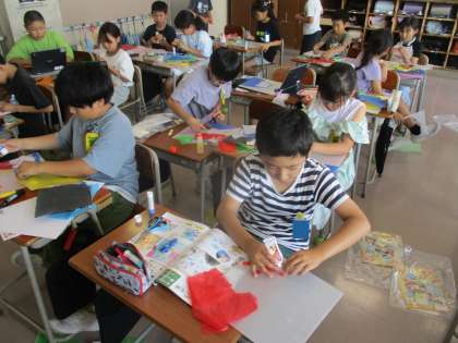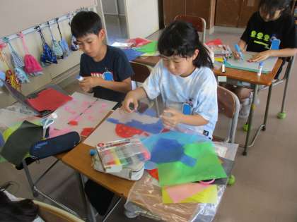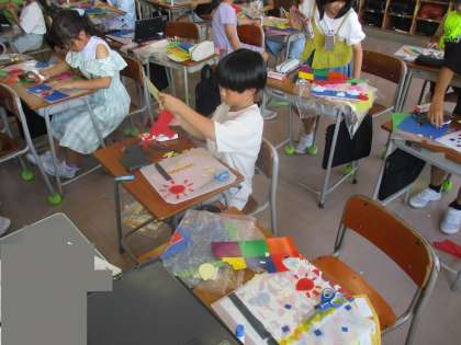 光をいかした作品にするため、透明なフィルムやラミネートにマジックで色をつけています。