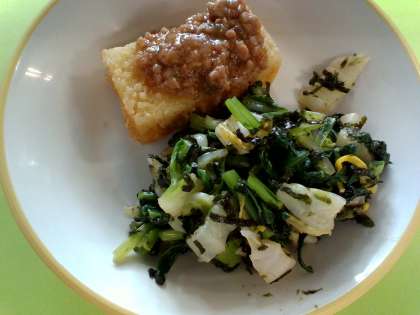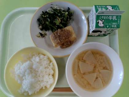 6月26日(水)今日の献立 公開日 2024/06/26 更新日 2024/06/26 給食室 ・ごはん ・牛乳 ・揚げ出し豆腐の肉みそかけ ・磯和え ・みそ汁 検食、異常なし。 みそ汁は、写真では分かりづらいですが、大根、人参、玉ねぎ、しめじが入っていました。揚げ出し豆腐も、サクサクに揚げられた豆腐の上に肉みそがかかっていて、とても美味しかったです。