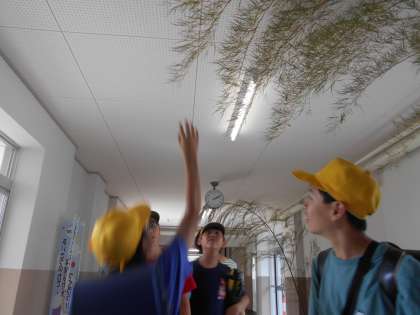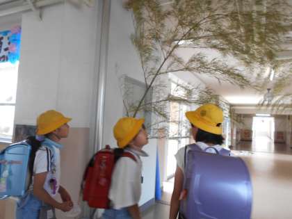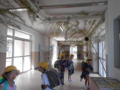 下校のため、児童玄関やってきたこどもたち。たなばたの竹を見て、「本物の竹なの?」とびっくりする子、願い事、何て書こうかな?と考える子、「家族とずっといっしょにいられますようにって書く!」と話す子。