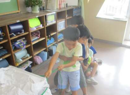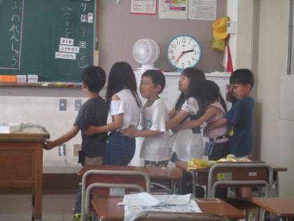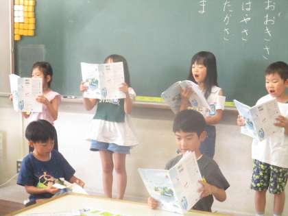 おおきなかぶの「うんとこしょ、どっこいしょ」の言い方を考えて練習しています。それぞれの班で工夫を考えました。
