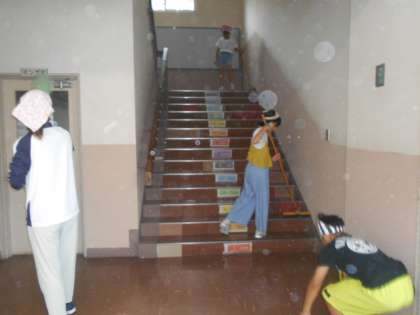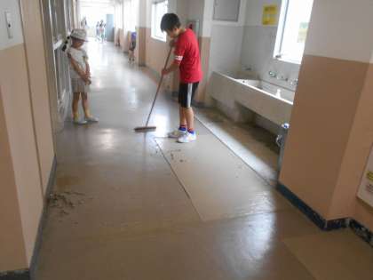 6年生が一番に清掃場所に来て、働いています。さすが最高学年、学校のリーダーです。後から来た下級生は、その姿をみて、黙々と活動し始めました。