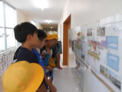 昨日のワークショップでいただいた資料を、体育館入り口に掲示しました。子供たちは興味津々です。