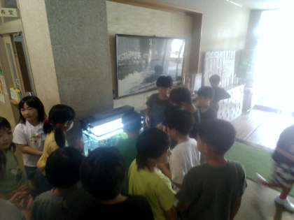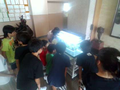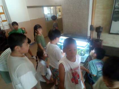 大休憩に子供たちが集まってきました。 「何匹いるのかな」「エサは食べたの?」と興味津々の子供たちです。