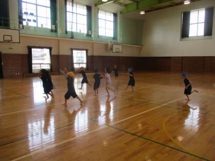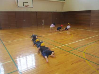 体育でいろいろな動物になりきりました。へびになるためにつながったり、手をうさぎの耳に見立ててジャンプしたりしました。