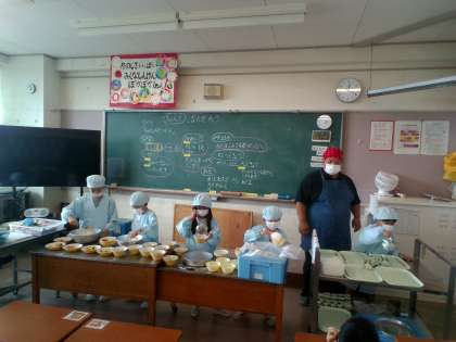 2学期の給食が始まりました。1年生の子供たちも、準備は慣れたものです。