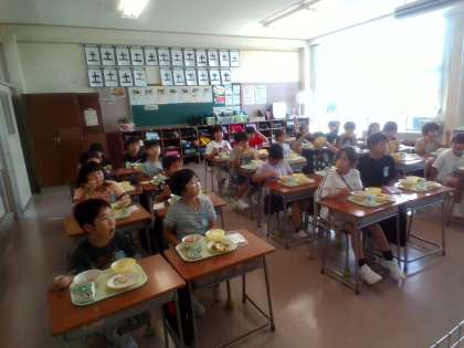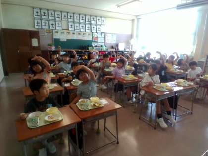 楽しみにしていた給食の時間です。 みんな、そろって「おいC!」