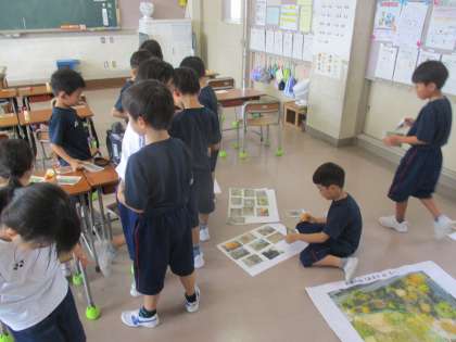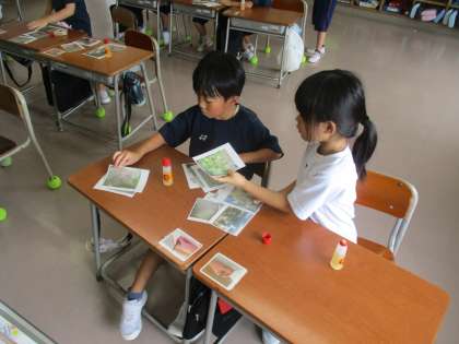 天瀬の森で互いに撮影した写真をもとに、天瀬の森の生き物を調べました。かきの実や昆虫などたくさんの生き物を見つけました。
