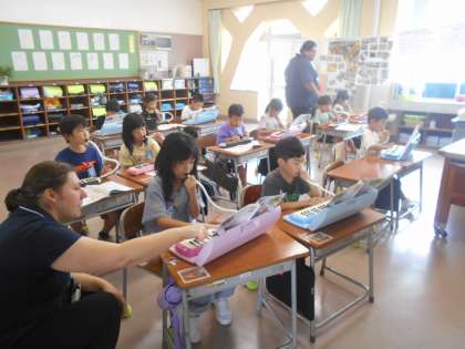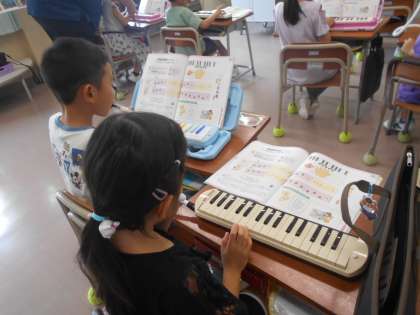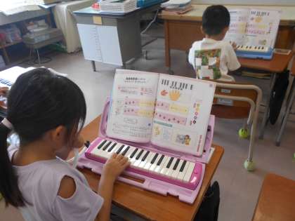 鍵盤ハーモニカの学習です。鍵盤の指の運び方も練習しています。