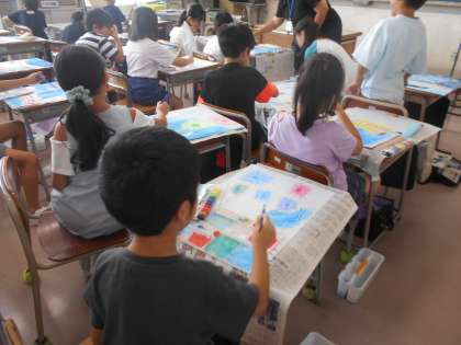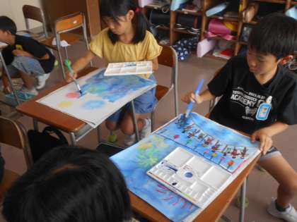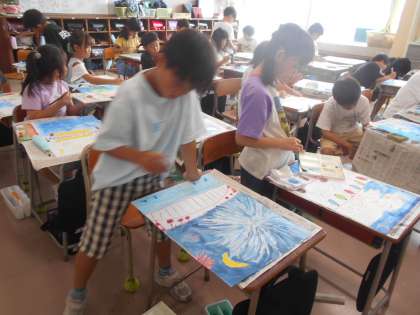 3年生 図工 公開日 2024/09/03 更新日 2024/09/03 3年生 夜空に上がる花火の絵を描いていました。 筆に水をたっぷり含ませて、クレヨンで描いた花火をはじき、空の濃淡をうまく表現していました。