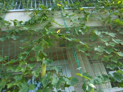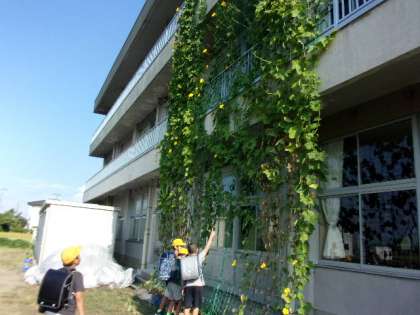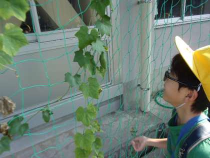登校してすぐに、校舎の上の方を見上げている子供たちがいました。ヘチマの実を見ていたようです。数を数えたり、一番大きな実を探したりしていました。育ててきたヘチマが実り、とても嬉しそうでした。