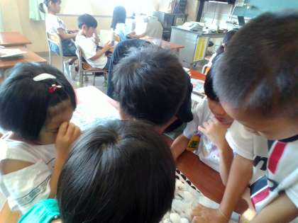 「ノラネコぐんだん いろいろさがしえブック」を見ている子供がいて、周りの子供たちと一緒にお題のイラストを探していました。