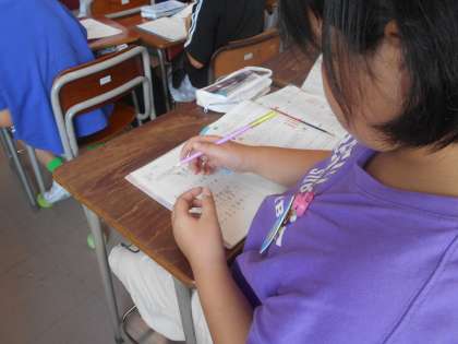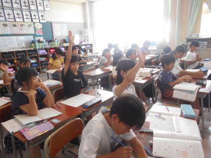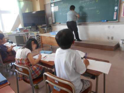 あまりのある割り算の学習です。教科書の問題をすべて解くことができ、先生オリジナルの「先生問題」が出題されていました。「先生問題を出題します」と告げられると、子どもたちは「ようし!」と一段と気合いが入った様子でした。