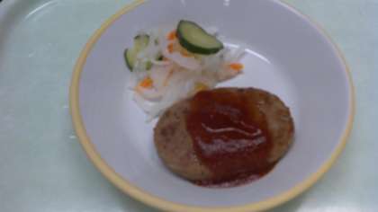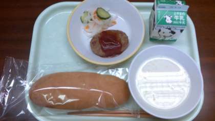 コッペパン 牛乳 ハンバーグのケチャップかけ