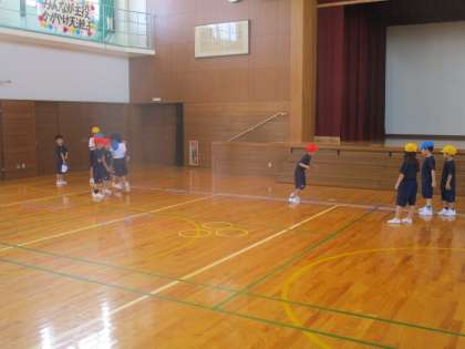 フラフープを転がしたり、けんけんジャンケンをしたりするなど、いろいろな体つくりの運動に取り組みました。