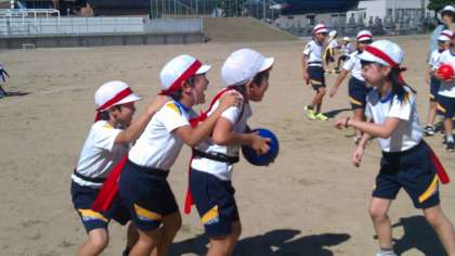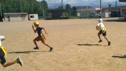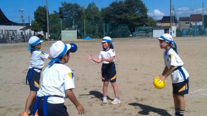 体育ではタグラグビーの学習を始めました。まずはタグを腰につけて、ボールを持って慣れるところから。