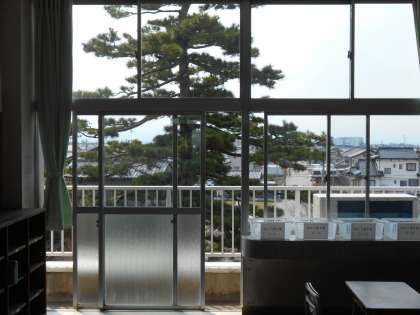 この教室は、5年生教室です。3階の窓から見ても松の木のてっぺんが見えません。