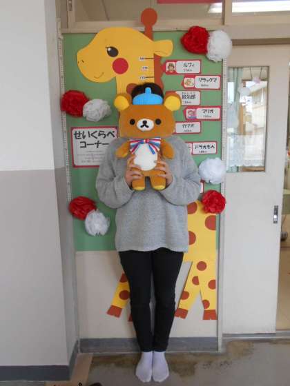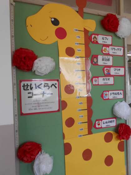 保健室前に、大きなキリンのせいくらべコーナーができました!