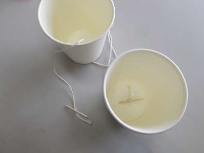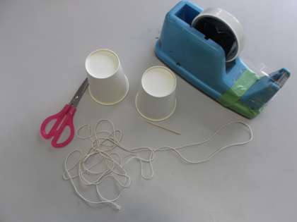 ざいりょうは、紙コップ2つ、つまようじ、たこ糸、セロテープ、はさみです。(写真1)