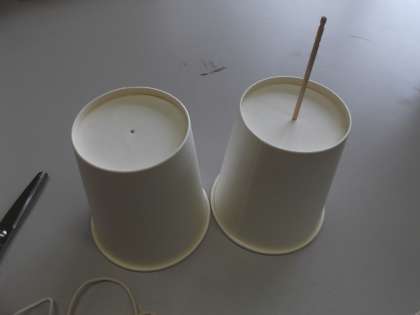 1 紙コップのそこに、つまようじであなをあけます。(写真2)