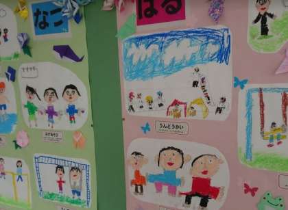 一年生の廊下には、二年生の絵が並んでいます。学校生活を語るのびのびとした絵は、新入生にとって大きな意味をもつ教材です。私が担任だったら、一ヶ月はこの作品を使って、国語や算数、生活等の勉強を進めるかもしれません。絵を見ながら、「一年生になったら・・・」と、見通しやめあてをもち、これからの生活の期待感を広げます。その過程で、仲間の話の聞き方、話し合いのルールから、集団生活のルールを学んでいきます。仲間と学び合う楽しさや意義も感じとっていきます。一枚の絵から、二年生の活動の様子を想像したり、心持ちや気持ちを推測したりすることは、相手を思いやる心の入口となります。集団の中での仲間との関わり方を考えることになります。