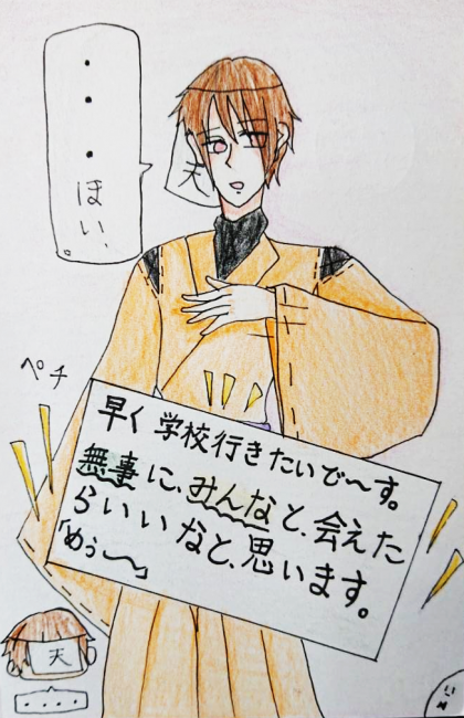 Rさんはおうちで絵を描いて、みんなへのメッセージとともに投稿してくれました。絵に書かれたメッセージを読むと、Rさんのやさしさを感じますね。そして、元気が出ます。Rさん、ありがとう!