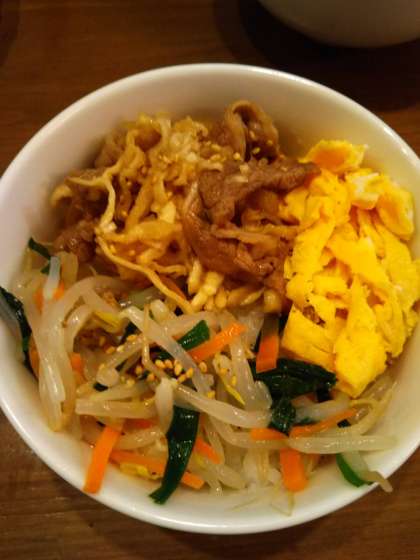 あったかいご飯の上にナムル、肉、錦糸卵を乗せたら、給食ビビンバの完成です。