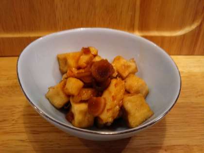 5、出来上がったソースを揚げた高野豆腐といかにからめる。