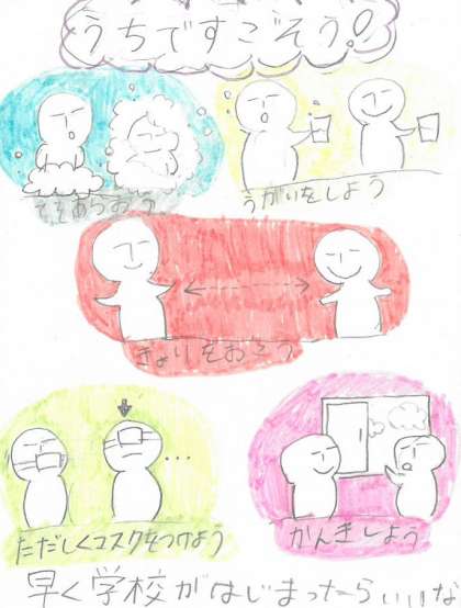 絵と言葉で気を付けることを分かりやすく教えてくれていますね。学校でもコロナウイルスに負けないように過ごしましょう。