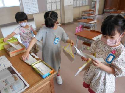 朝、ランドセルを片付けて提出物を出す様子です。先生に言われなくても、自分できちんと提出できるようになってきました。