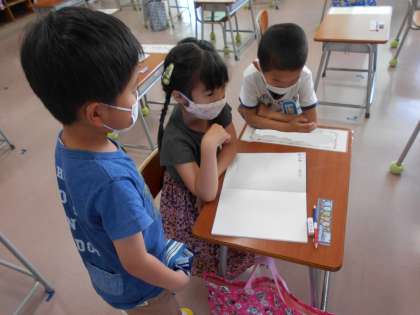 休み時間には、お絵かきをして過ごす子が多いです。友達の絵を見せてもらったり、お話したり、少しずつ友達ができてきたようです。