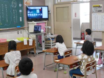 朝、再会式がありました。子供たちは、テレビ画面に映る校長先生の姿に興奮していました。