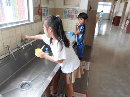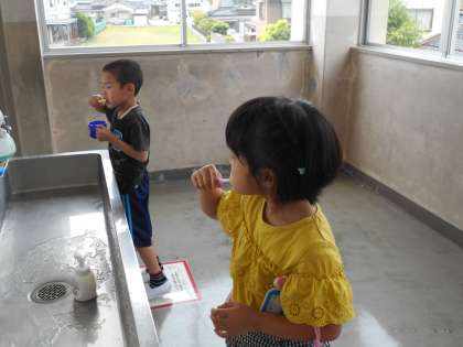 食べ終わった後は、「はみがきゾーン」に入って、歯磨きです。鏡を見ながら、みんな丁寧に歯を磨いていました。