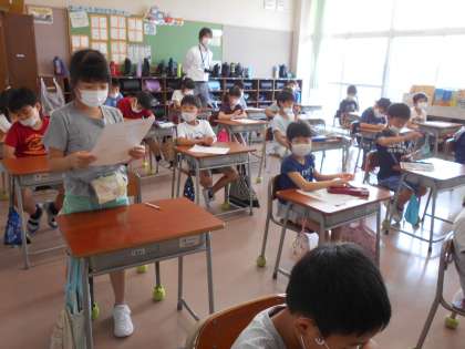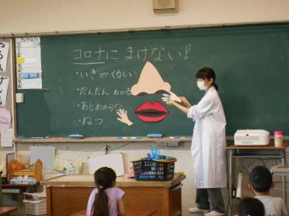 今日は2年生が、養護教諭と手洗い、マスク、距離をとる必要性についてやこれから自分が気を付けたいことについて学習しました。