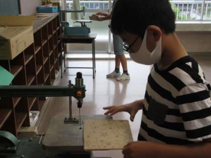 図画工作科の時間には、糸ノコギリを使って木の板を切りました。初めてとは思えないくらいに糸ノコギリを使いこなしていました。