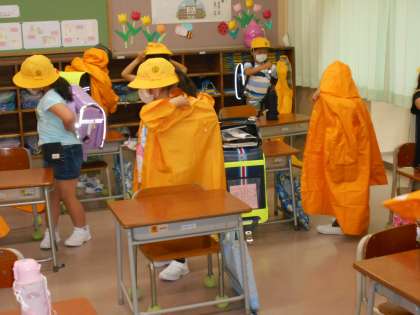 今日は、帰りの時間に雨が降っていたので、みんなでかっぱを着て帰りました。「手伝ってー!」と助けを求めたり、「やってあげる!」と友達を手伝ったりしながら、みんなで協力して着ることができました。