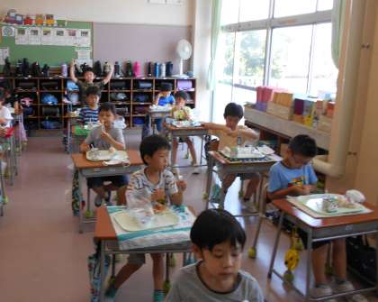 子供たちにとって初めての簡易給食。見た目が少ないので、子供たちは「これだけ?」と言っていたのですが、一口30回噛むと、結構時間がかかり、満足感もあったようです。たくさん噛むことで、食材の味を楽しむことができることにも気付いたようです!