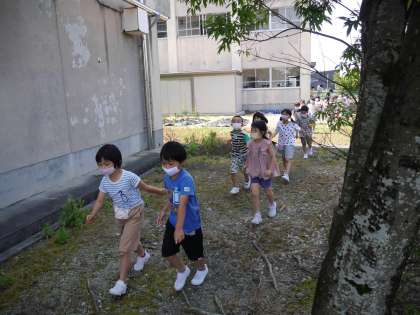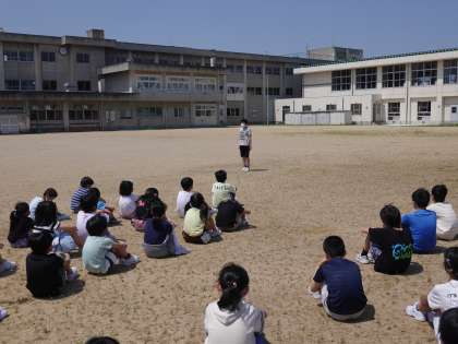 1年生も自分の教室からどこを通って避難するか確認しながら取り組みました。教職員も真剣に大きな声で人数報告をしました。6年生の代表児童が、「お・は・し・も」を守って、真剣に訓練できたことを全校の前で発表しました。