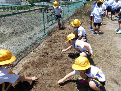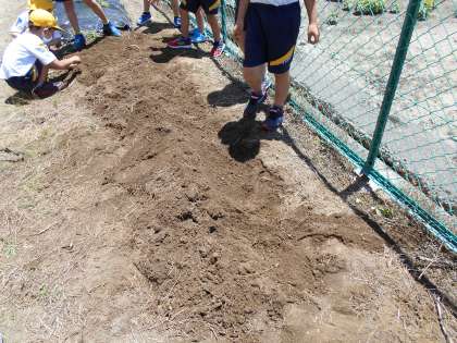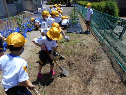 草を取る担当、取った草を運ぶ担当を自分たちで決めるなど、みんなで協力したので、あっという間に畑らしくなりました!2年生のチームワークは抜群です!