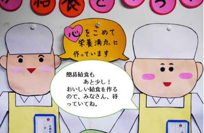 調理員さんたちは、少しでも楽しい時間になってほしいと工夫をしています。今日は、お笑いに給食ネタを絡めた楽しい放送をしました。
