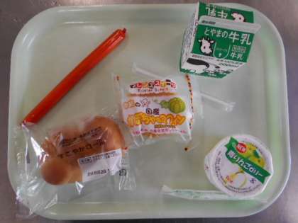 今日の献立は、牛乳、ロールパン、かぼちゃマフィン、ウインナーソーセージ、青リンゴゼリーです